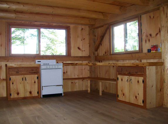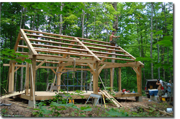 From these entrances to the two bedroom home, all parts and pieces are carefully crafted at the Woodlot and assembled on site. With careful measurements and layout all mortise and tenon joints, posts and rafters are cut and tuned. Then it is time for the “raising”.